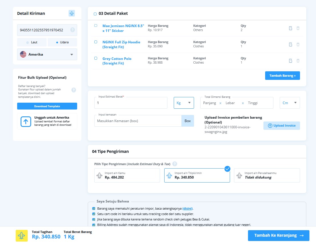 - Biaya yang lebih murah dibandingkan harus kirim manual menggunakan pengiriman premium seperti Fedex. Saya hanya keluar biaya Rp 833.970 dibandingkan harus mengeluarkan Rp. 2.212.915